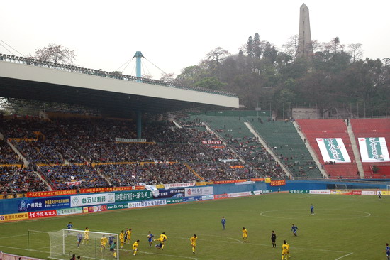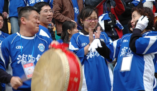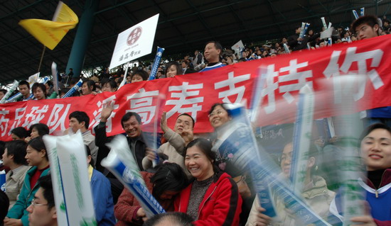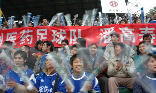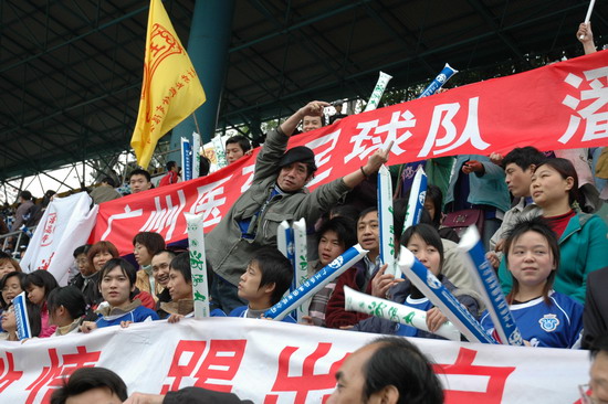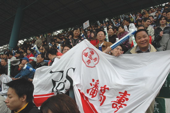 “燃烧你的激情,踢出你的自信”潘高寿药业300名球迷打出的横幅颇有气势。恰与球场火热的气氛相互应,其时,球场翻腾着一片蓝色的海洋(球迷们齐齐身穿获赠的广药队新赛季蓝色球衣)。广药集团下属近20家企业各组团的啦啦队各自各威风,齐为主队喝彩。只见手握充气棒,相互敲打,摇旗呐喊声不绝于耳……。广药集团对这场球赛相当重视,包括杨荣明董事长在内的多个高层领导亲临观战。“广州足球今年开了个好头”赛后广药俱乐部麦奇杰总经理喜形于色。而仅执掌穗足主帅教鞭18天的戚务生对这场“处子秀”评价道:“结果是可以令人接受的……。这场球赛胜利的意义在于,它让球员们更好地在中甲联赛正式开打前期找到比赛的感觉”。