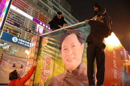 他们的团队有两个特点——埋头苦干不张扬;齐心合力似家人。连日追踪访问,聚焦看:负责渝中区的彭正琴,促销场上常拉上两口子——“老公”做车夫,女儿帮着派传单……。最近一次步行街服务日,督导员黄金华又令其夫连夜赶制“惊喜30分钟”的抽奖海报……。他们以“公”为家,用他们的话说是以“老板”心态做事。于是,这种“主人翁”的精神就处处在群体中体现,劲也特别足。12月2号,全国药交会还未完,瞧这“一家子”,早已兵分多路,兼顾翌日在解放碑举行的大型服务日活动。是夜,“举家”在中心广场顶着寒风搭建公司展场。综合部赵军经理收到料急call,我赶到时,他们的“高空作业”基本完成(见图)。“他们让我很感动”赵经理动情地说。我怪他们不早说,好让我拍到好镜头。废话了。他们的秉性就是多做不说的。何竺松分管的这支一线队伍,11人(5个业务、4个驻点、2个管理)掌管着重庆、江北、渝中、巴南等九个区上百家目标药店以及拓展新药店和郊县地区。他们的居所虽远,但风雨无阻,坚持8:30~5:30的工作制度(上午一定报到)。山城药店多且散,他们奔波劳碌,几乎每天超时工作,但从未有人要补助的……