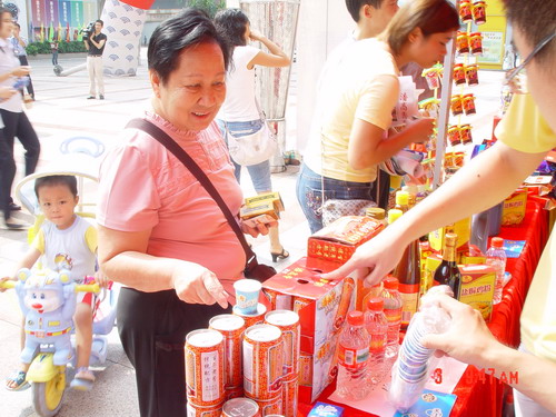 活动现场人头攒动,番禺区30多家知名企业在场设立了服务台,接受消费者的咨询及投诉。我司作为特邀企业之一参加了本次活动。我司市场部人员通过展示公司宣传图片,派发传单,促销产品,接受市民咨询,教授如何识别假冒伪劣产品等系列活动,受到了市民的热捧。市场部的金文顺始终保持着他那可爱的笑脸,为前来的顾客倒凉茶、解疑问,吸引了众多的男女老少们,成为当天现场促销额最高的企业。他们认潘高寿的品牌,“老字号,信得过”一个客户这样直白。一旁的广州酒家利口福的促销员忍不住打起他的主意:“靓仔,你叫什么名字?”,“你这么能干,也帮我们促销促销可以吗?”“我的小名不记也罢,记住我们潘高寿就行了”,金文顺有点自豪地说道。