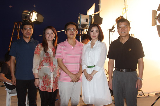 公司和产品营销中心主要领导亲临拍摄现场跟进相关工作,从右至左分别为公司副总经理徐文流、影视明星关咏荷、市场总监程宏辉、市场部副经理戴梅和销售二部总监王运龙