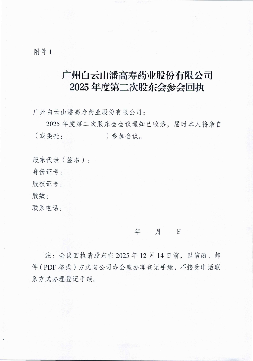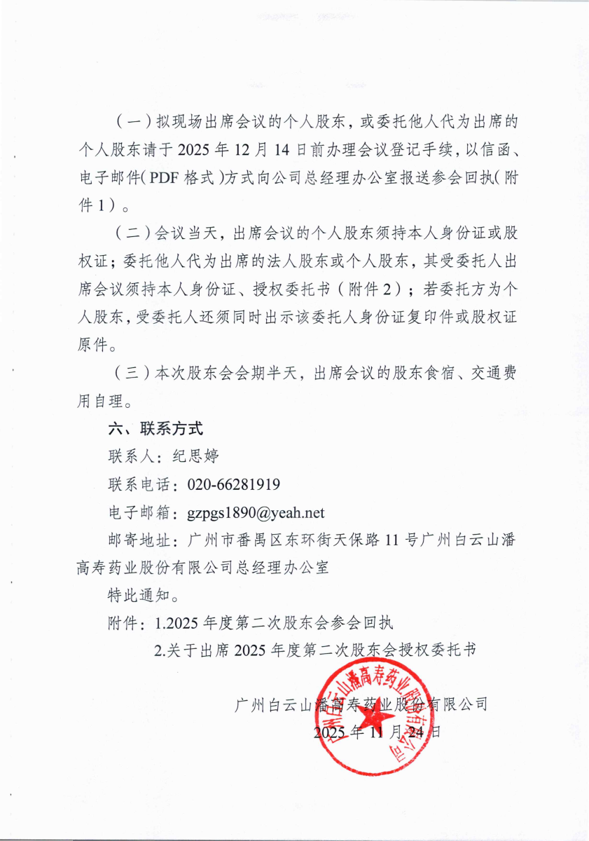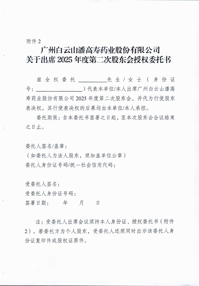 广州白云山潘高寿药业股份有限公司关于召开2025年度第二次股东会的通知