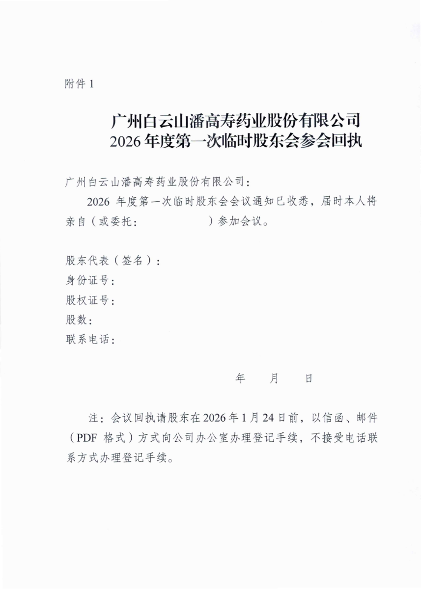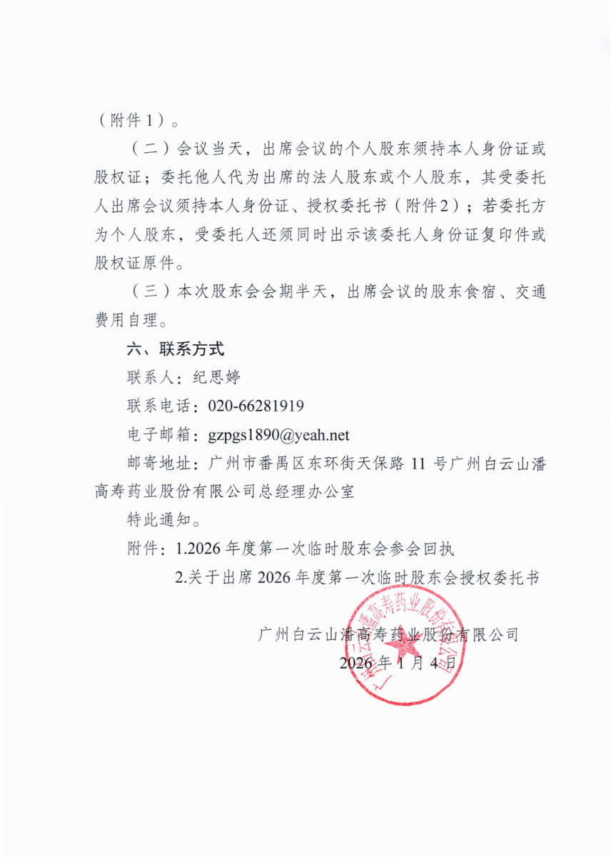 广州白云山潘高寿药业股份有限公司关于召开2026年度第一次临时股东会的通知