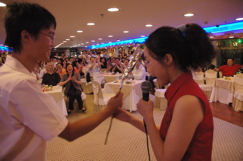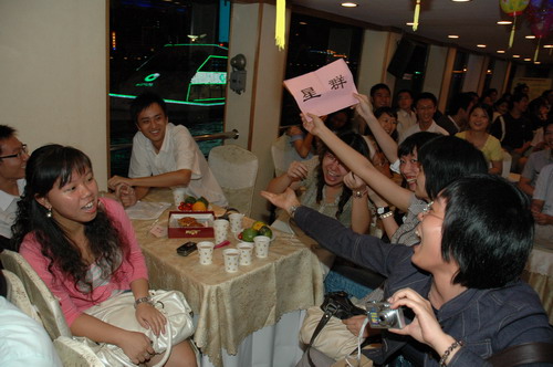 为加强两家企业新员工间的交流,晚会还特意穿插了《真情传递》、《拥挤的公交车》等游戏,与观众互动。星群与潘高寿的员工们不分彼此,在“拥挤的公交车”中传递着欢乐,更传递着真情。台上、台下欢声笑语,船内和谐一片。此外,还有让人惊喜万分的幸运大抽奖。精彩处当数由吕部长抽的一等奖,由于第一次抽出的获奖者不知去向,又进行了第二次抽奖,最后由星群药业的黄碧莲戏剧性地中奖,获得了电磁炉一台。