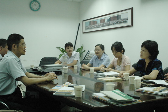 杨震澎副总经理(左一)向郑楠党委书记(右一)一行介绍企业文化经验