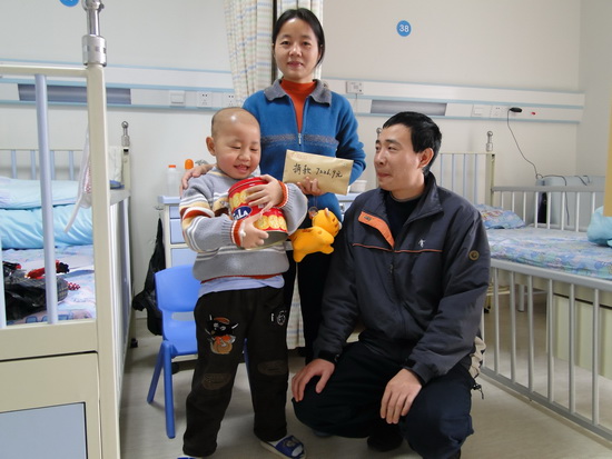经过这段时间的治疗,朱盛鹏的精神明显好转,有了笑容,在医生查房时会顽皮的摘下医生的听诊器。与上次在医院见到的情形相比,就像一棵蔫了的小草又慢慢恢复了活力。据医生介绍,从目前来看孩子的病情基本得到控制,属于中危程度白血病,治疗方案预计五个疗程,如无意外孩子康复的希望很大。