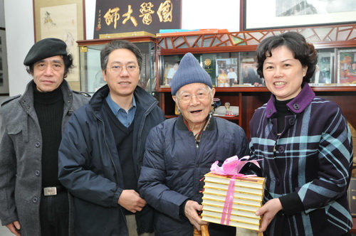 邓老位于中医药大学的家里喜气洋洋, 郑楠和谭月圆、李溢南分别代表潘高寿药业和开平家乡人民向邓老致以节日的问候,敬祝邓老健康长寿!郑楠书记感谢邓老一向来对潘高寿药业的发展以及企业文化工作的关心和支持,月山中学李溢南校长对邓老为家乡教育事业作出的无私奉献致以衷心的感谢,开平市政府市志办谭月圆主任代表家乡人民祝邓老健康长寿、新年快乐、如意吉祥!