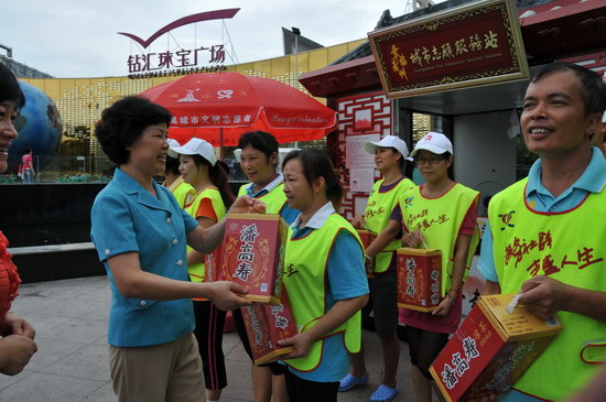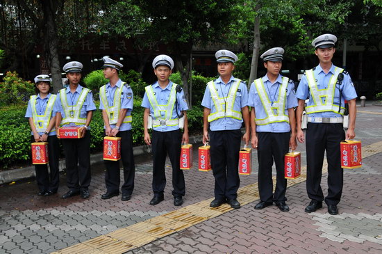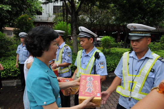 潘高寿郑楠党委书记、市桥街道办事处金主任一行来到市桥交警大队第一中队所辖下马路上,向执勤的交警、交通协管员送上解暑凉茶,向为畅通城市交通而辛勤工作的交警们表达敬意。又来到八月广场,向幸福广州城市志愿服务站的志愿者们送上凉茶。同时,倾听志愿者们服务社群的新鲜事,为他们无私的奉献精神所感动,也为他们鼓励打气,齐勉力,为广州创建文明城市挥洒汗水。