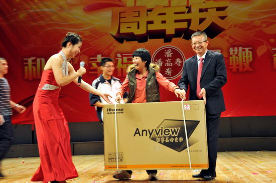 当然,潘高寿的发展离不开潘高寿人的艰辛努力。会上,魏总宣读了2011年“双达标”劳动竞赛表彰先进(先进集体、五好达标班组、潘高寿之星、三十年工龄员工)的决定。各获奖集体和个人激动陈词表达对企业的感恩之情。接着,大家以劲歌热舞来庆贺企业生日。演出的《永远跟党走》、《相亲相爱一家人》、《咱们工人有力量》等十多个节目全为员工们自编、自导、自演。其中大型时装音乐剧《和谐企业》逾70人参演,公司班子成员到一线生产员工齐齐参与。节目展现了潘高寿人热爱生活与工作、锐意进取的精神风貌;彰显的是潘高寿人在广药集团“大南药”、“大健康”产业、“136”战略的指导下,发挥智慧与力量,续写潘高寿的百年辉煌!
