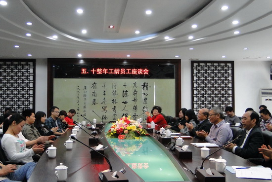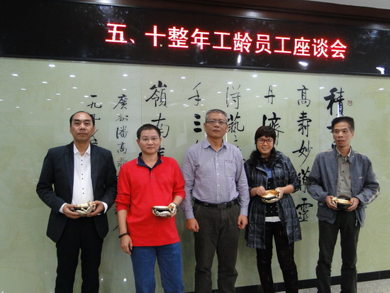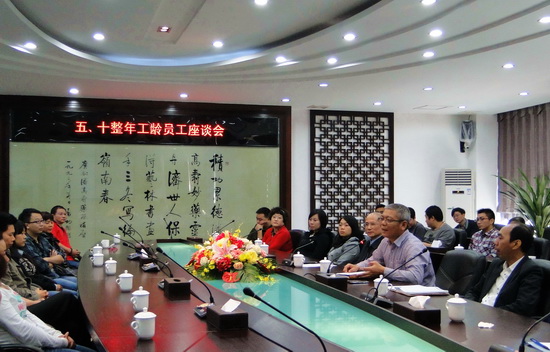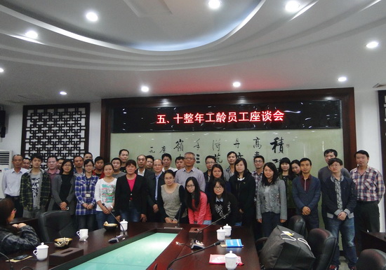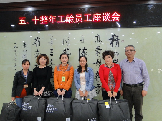 1120日下午,白云山潘高寿药业五、十整年企业工龄员工座谈会在办公楼一楼会议室举行。董事长、总经理杨东升,纪委书记、工会主席梁志平与企业工龄届满五年、十年、二十年、三十年整的员工参加了座谈会。