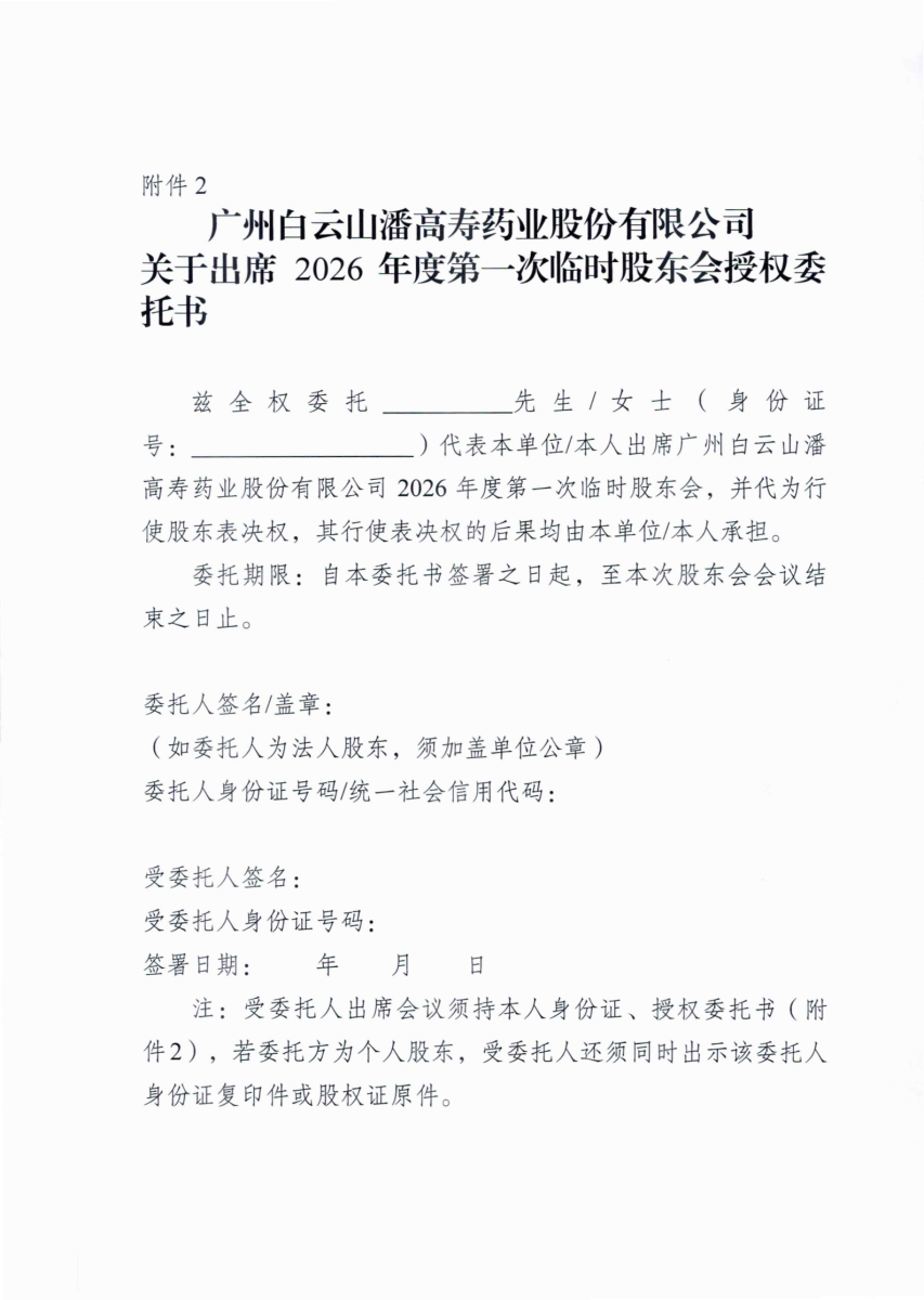 广州白云山潘高寿药业股份有限公司关于召开2026年度第一次临时股东会的通知